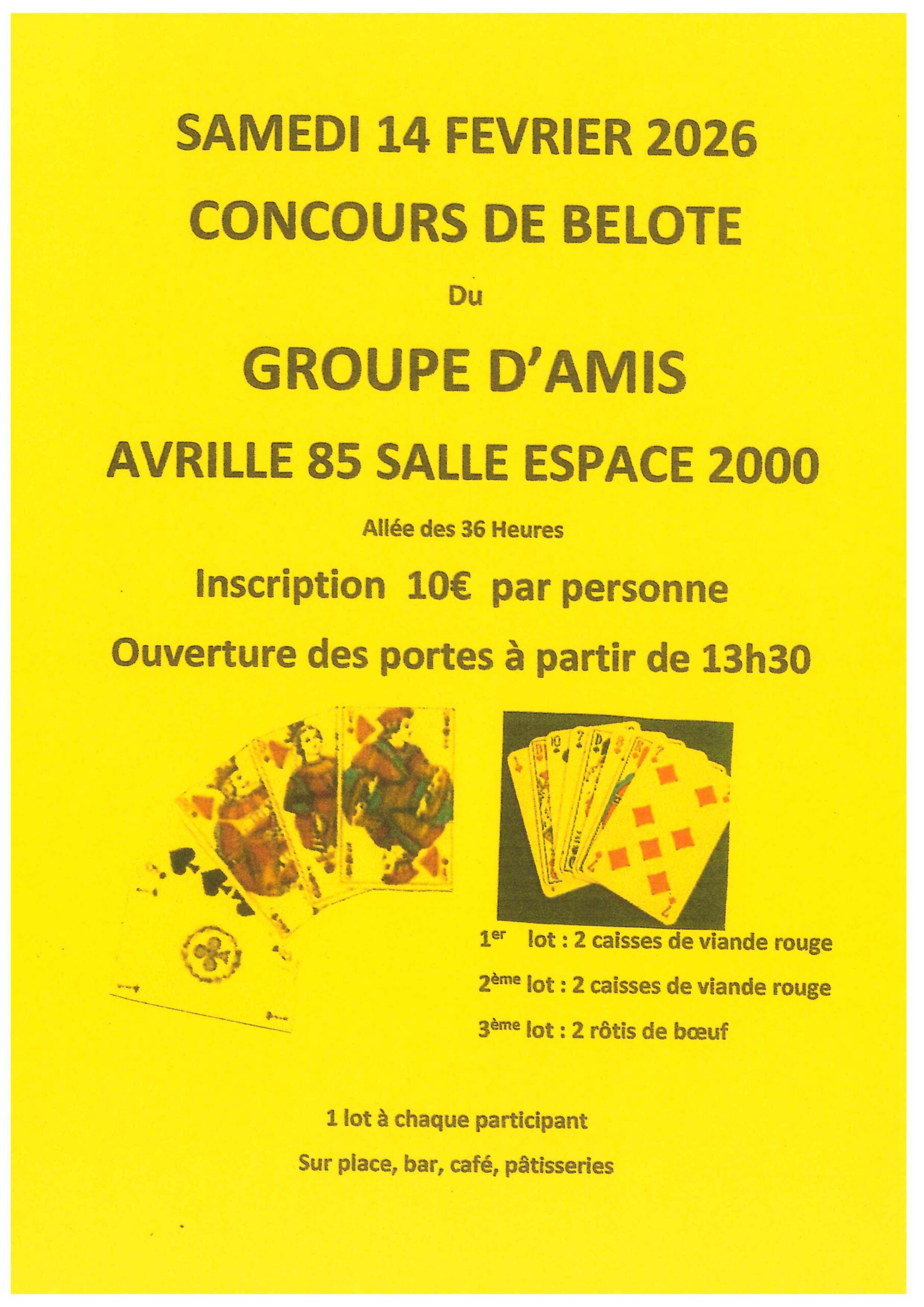 14 février @ 13h30 Concours de belote Groupe d’Amis Salle Espace 2000 Allée des 36 heures, Avrillé, France Concours de belote organisé par l'association Groupe d'Amis 10€
